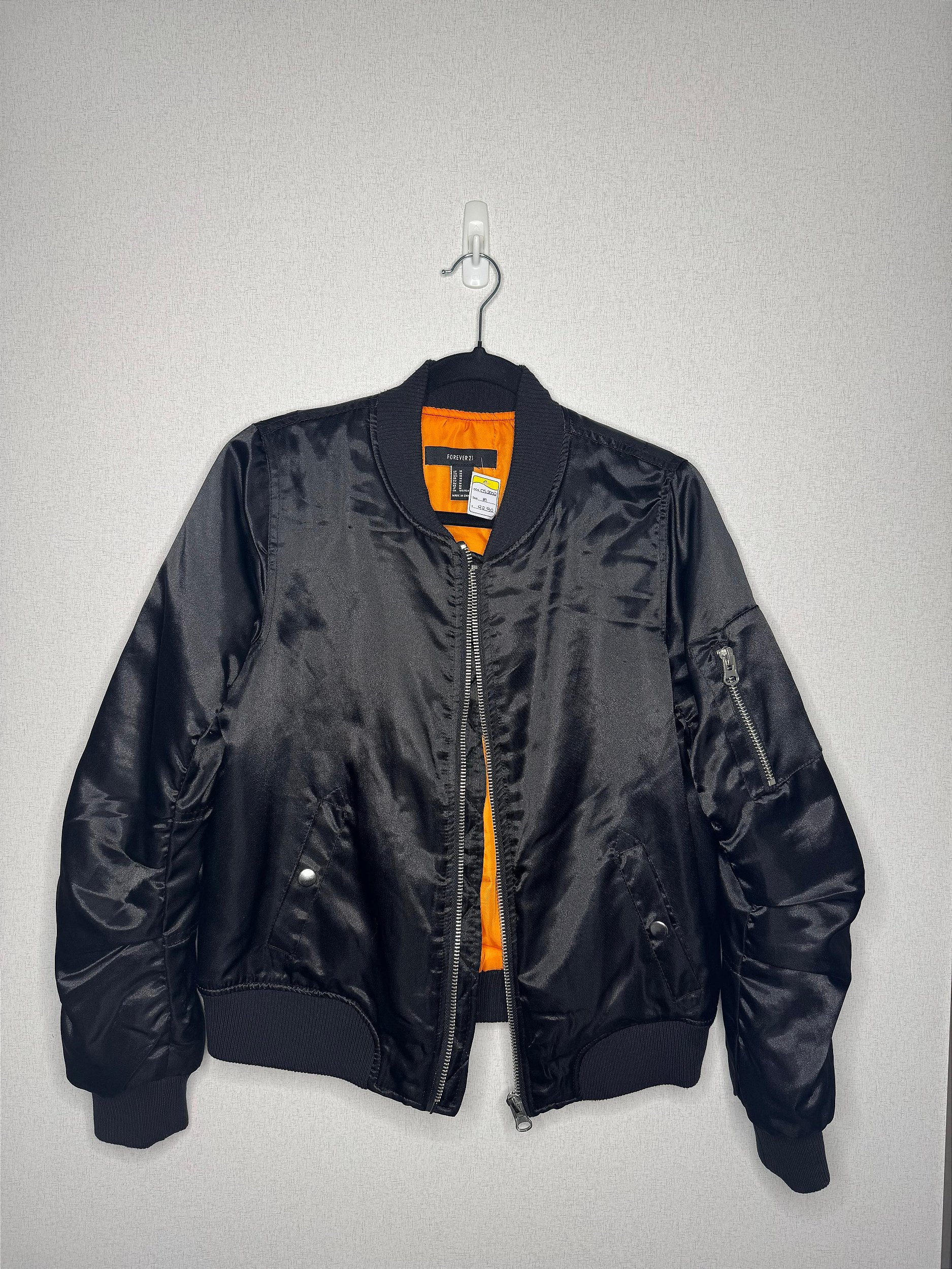 Jaqueta bomber feminina Forever 21 com estética urbana sofisticada e acabamento premium. Confeccionada em tecido acetinado preto, possui leve brilho elegante, que eleva a peça e traz um visual moderno e refinado. O forro interno laranja contrastante adiciona personalidade e valor ao design, além de oferecer maior conforto térmico.